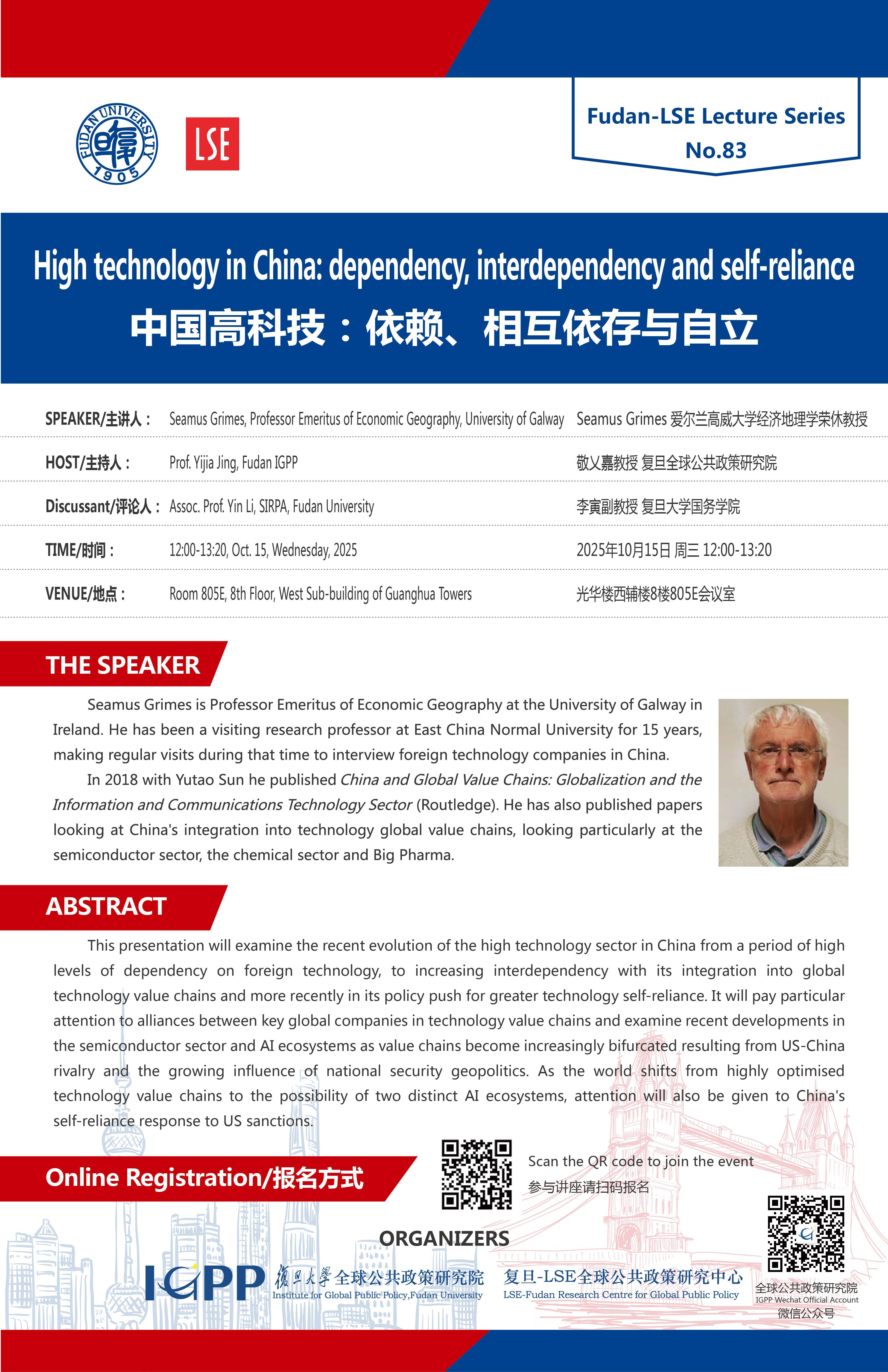 This presentation will examine the recent evolution of the high technology sector in China from a period of high levels of dependency on foreign technology, to increasing interdependency with its integration into global technology value chains and more recently in its policy push for greater technology self-reliance. It will pay particular attention to alliances between key global companies in technology value chains and examine recent developments in the semiconductor sector and AI ecosystems as value chains become increasingly bifurcated resulting from US-China rivalry and the growing influence of national security geopolitics. As the world shifts from highly optimised technology value chains to the possibility of two distinct AI ecosystems, attention will also be given to China’s self-reliance response to US sanctions.