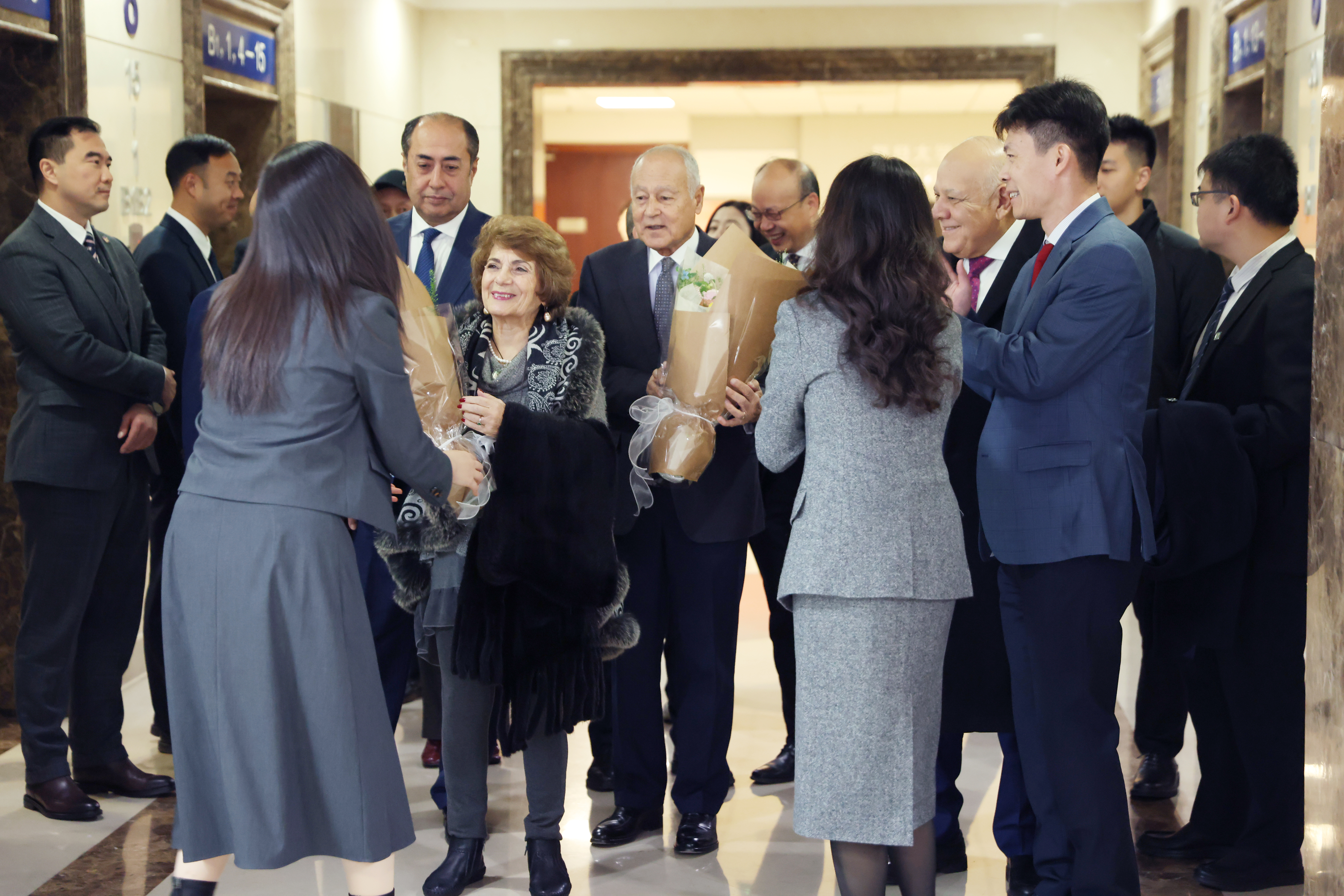 授证仪式开始前,盖特秘书长率领阿盟秘书处代表团对全球院进行了参访。敬乂嘉院长和全球院师生热情欢迎盖特秘书长一行,全球院学生代表为秘书长夫妇献花。