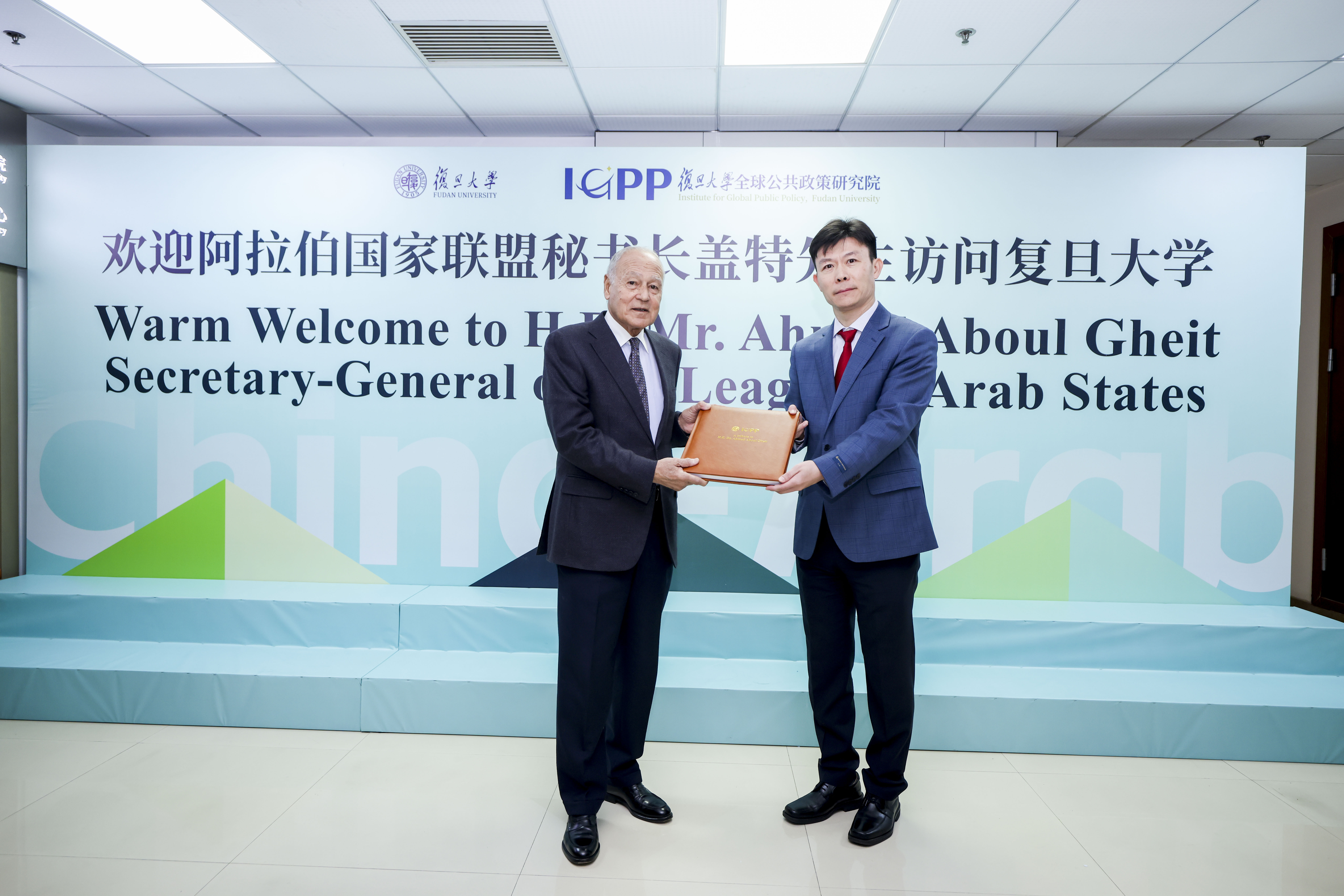 在礼物互换环节,敬乂嘉教授向盖特秘书长赠送了反映复旦大学与阿盟秘书处、阿拉伯大学协会以及各阿拉伯学术与公共机构合作进展的精美相册。盖特秘书长表示这些记录下来的发展都将是一个新的过程的开始。盖特秘书长将其撰写并签名的《见证:战争与和平》《我的见证:埃及外交政策(2004—2011)》(中文版)作为回赠,并赠送了篆刻古埃及象形文字的罗塞塔石。