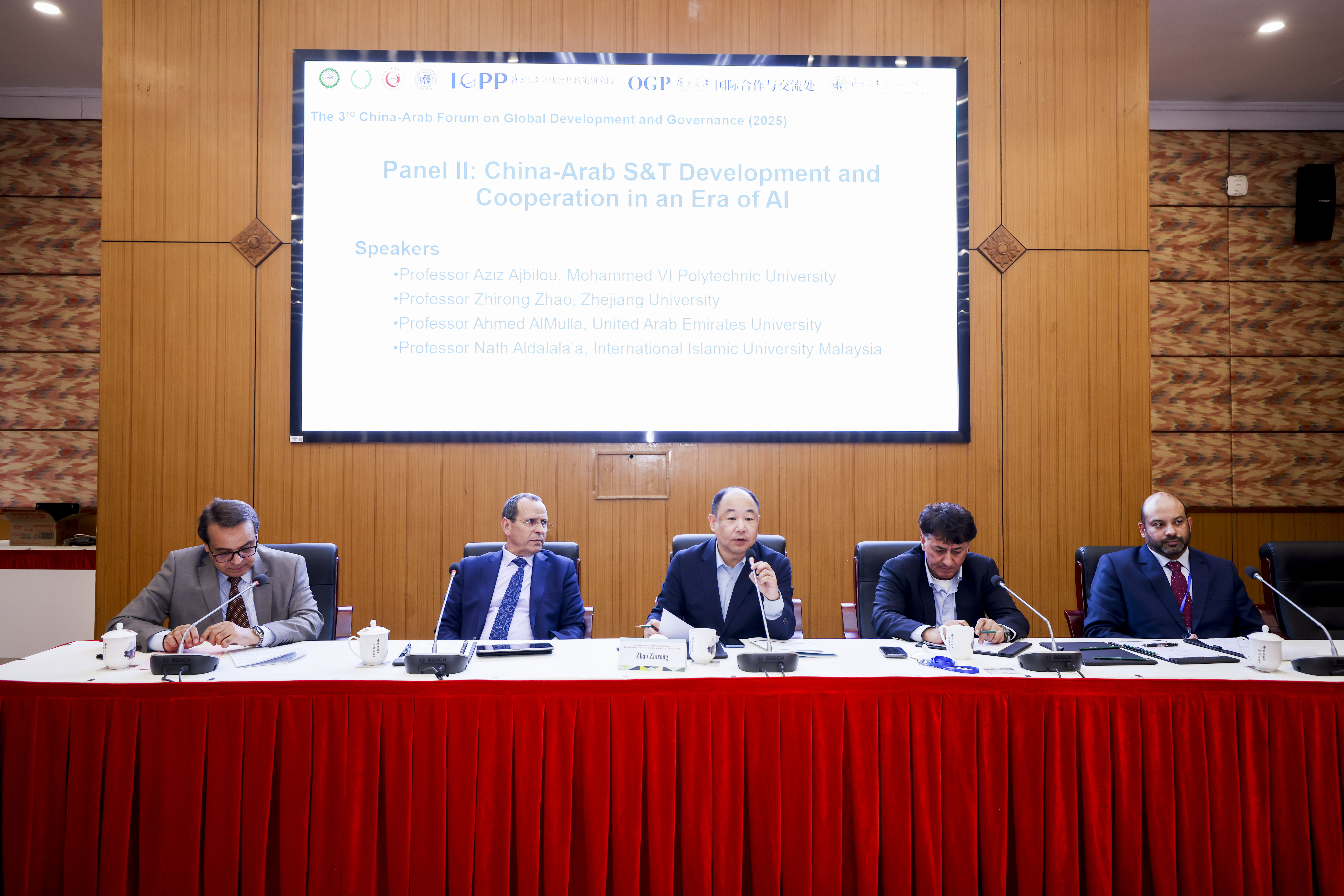 萨拉梅教授主持“AI时代的中阿科技发展与合作”圆桌,穆罕默德六世理工大学Aziz Ajbilou教授、浙江大学赵志荣教授、阿联酋大学Ahmed AlMulla教授、马来西亚伊斯兰国际大学Nath Aldalala’a教授参与圆桌讨论。与会嘉宾就当前全球新兴科技发展态势、科技竞争与合作、中阿在人工智能领域的合作前景等开展了丰富的研讨。