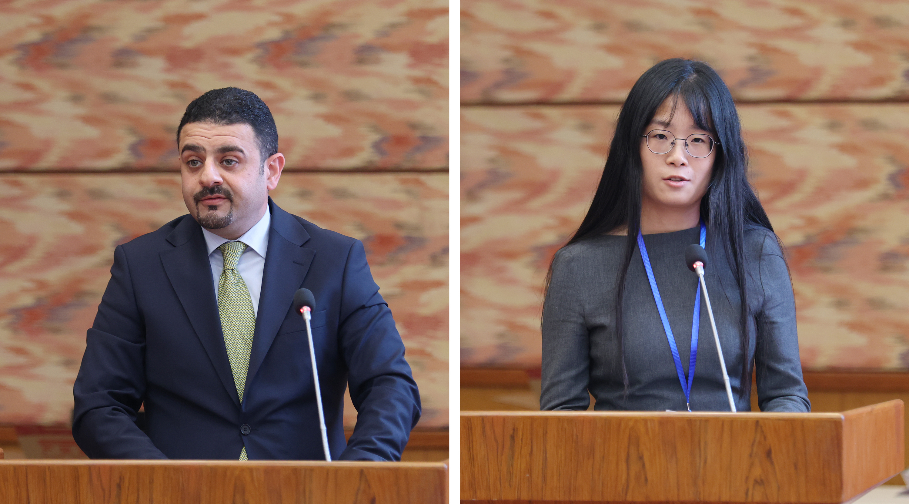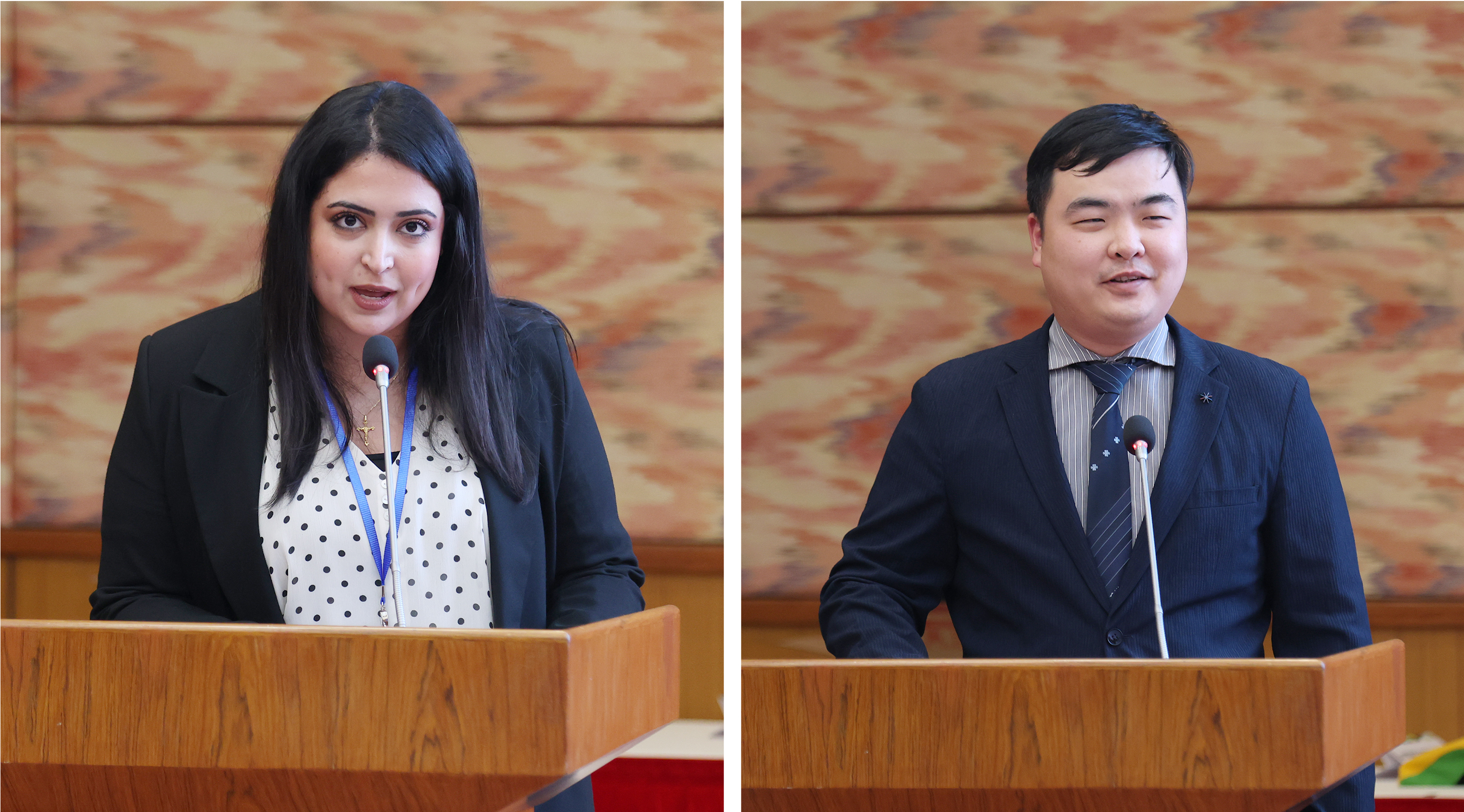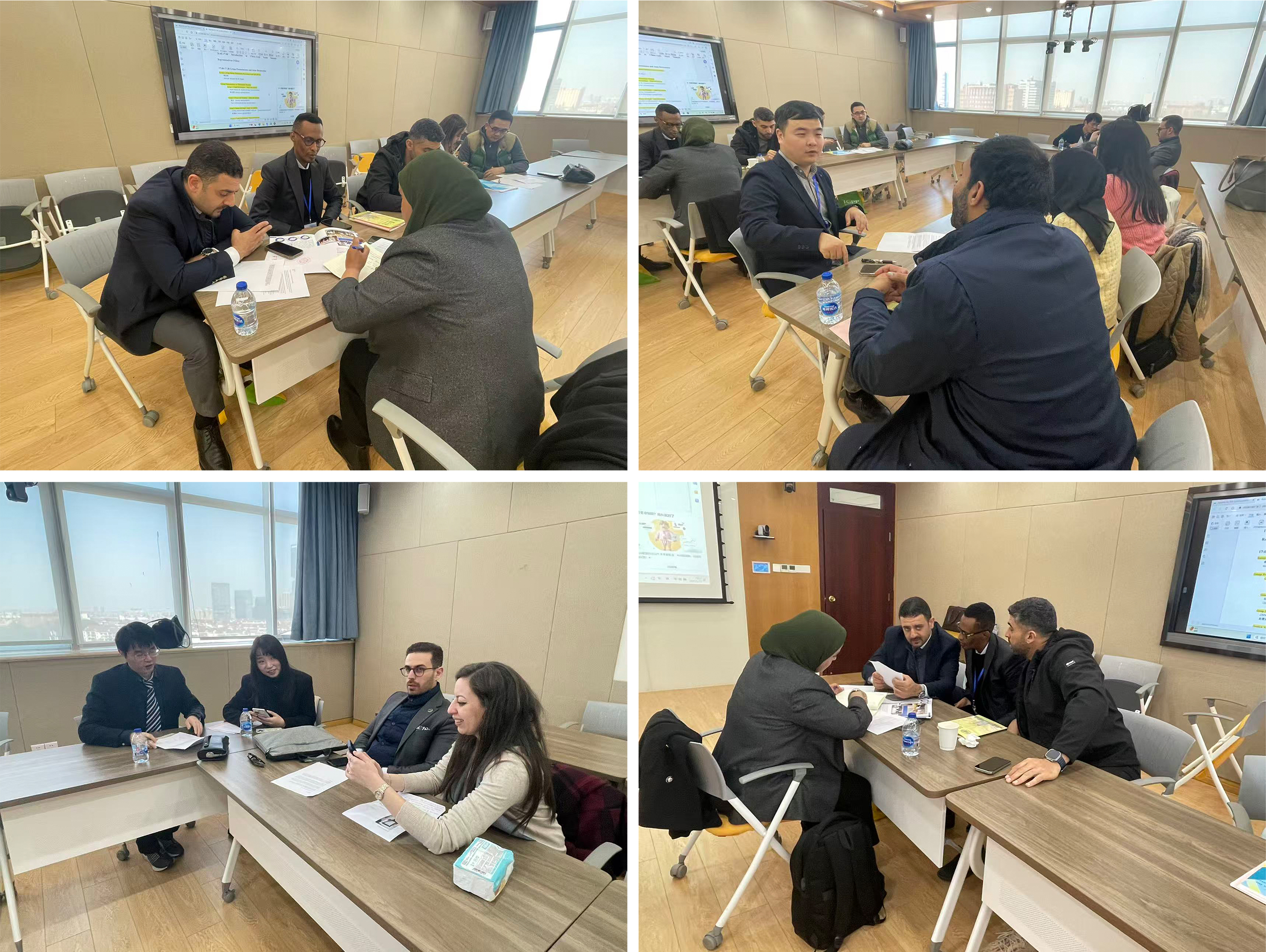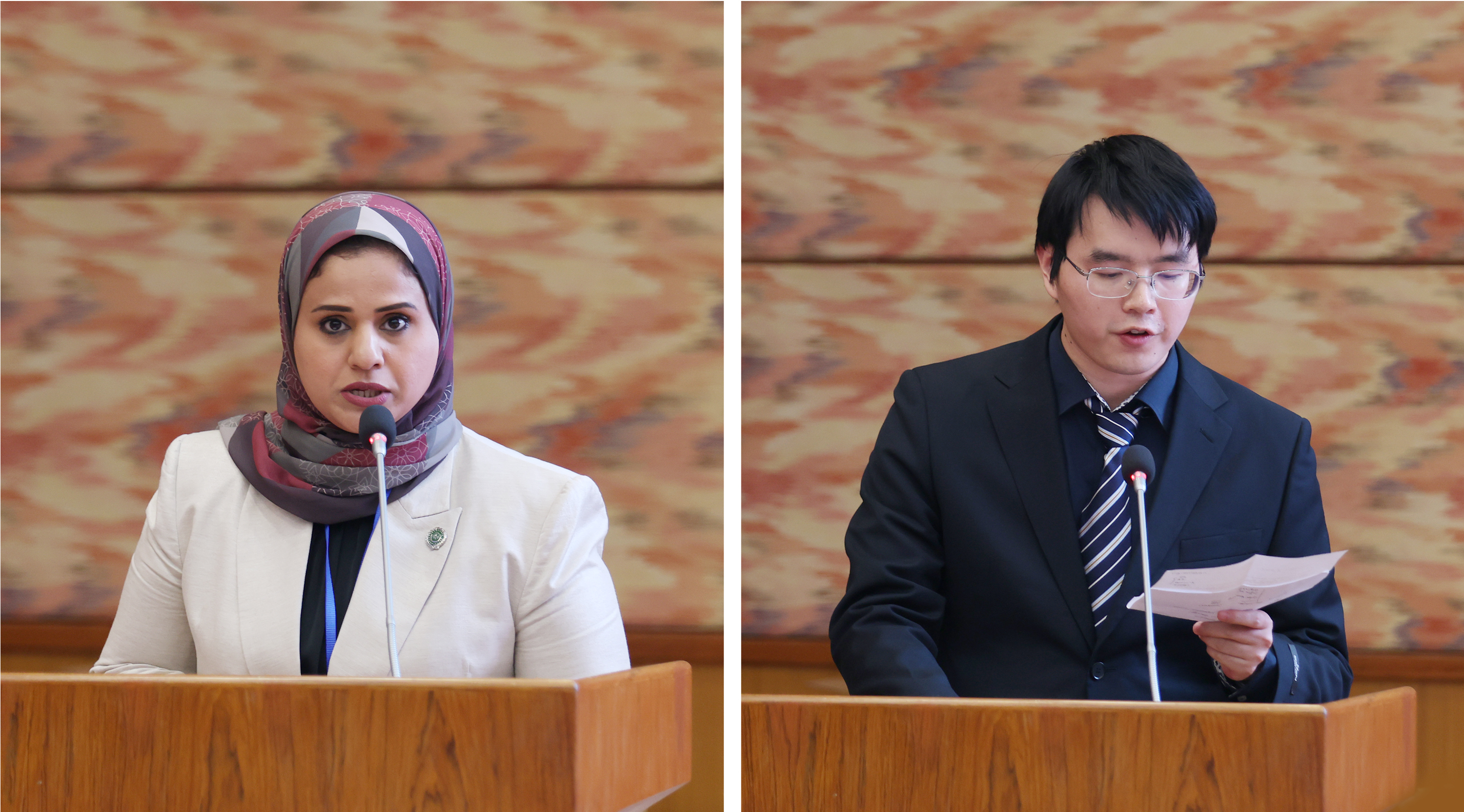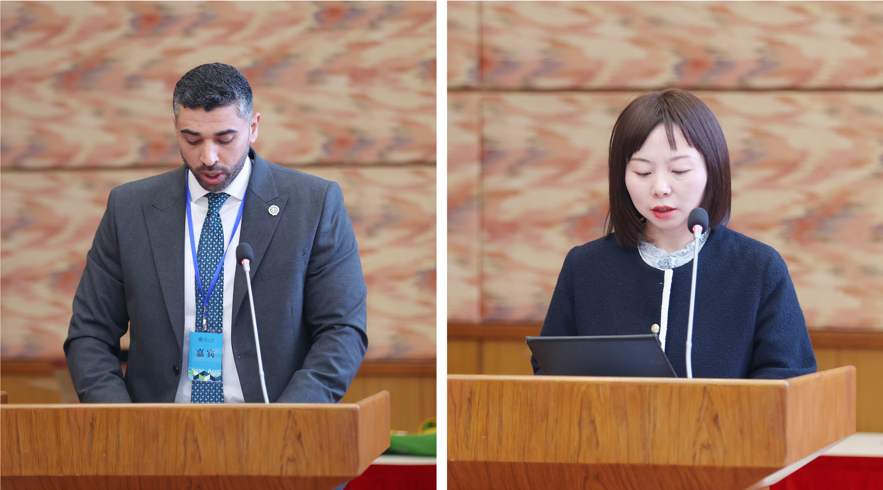来自阿盟的法律官员Wehdah Mosaed Ali Al-Shaeri与复旦全球院博士后黄廷钟共同回顾了会前的小组讨论过程。小组讨论围绕全球治理、中阿关系、数字丝路、青年成长四大核心议题有序展开,中阿青年代表按议题交叉分组,每组推选中阿各一名组长统筹讨论、记录要点,确保交流高效聚焦。