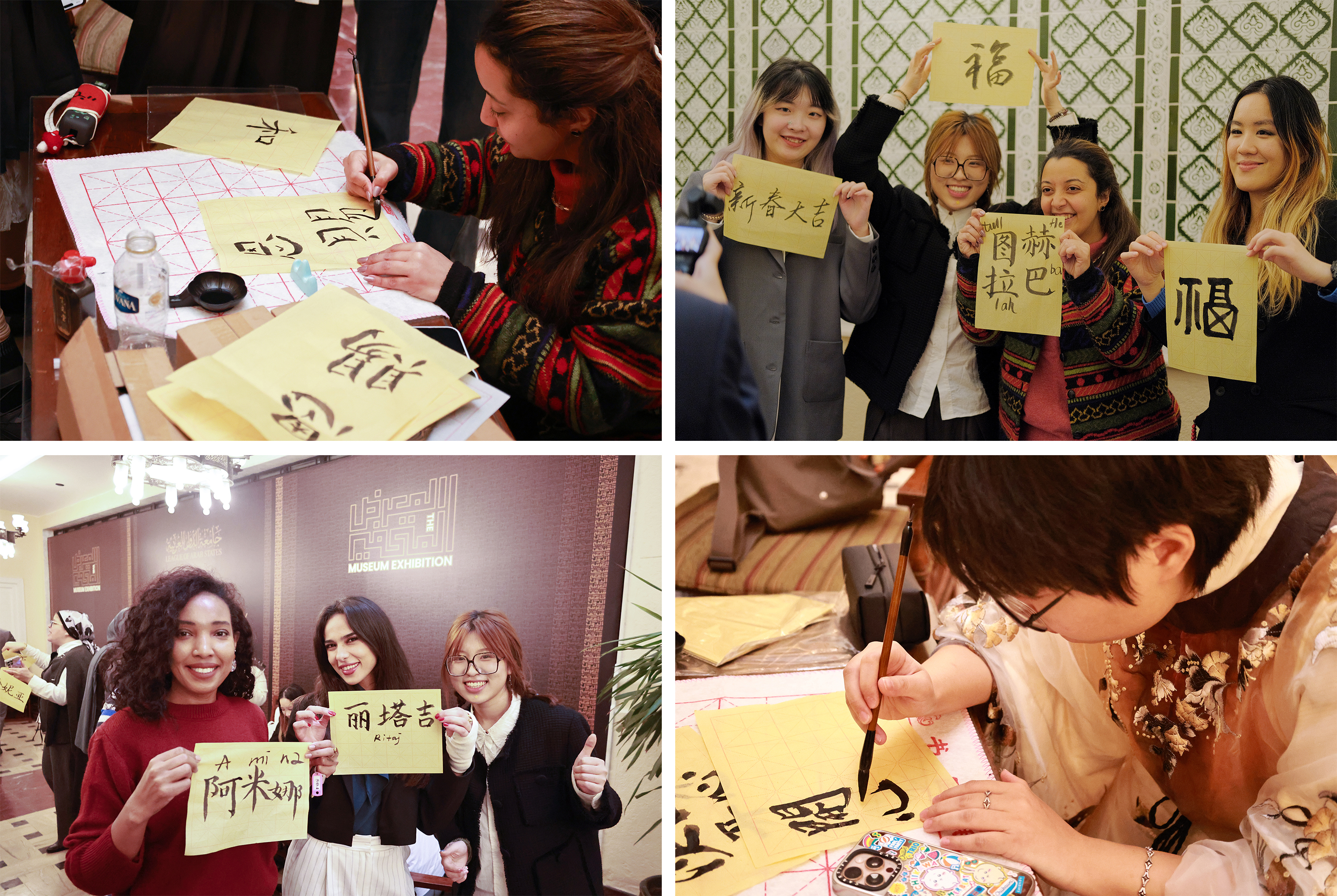 书法体验区同样气氛热烈,实习团成员一边示范汉字书写技法,一边为阿盟官员书写其阿拉伯姓名的中文音译。一位官员在接过写有自己名字的作品后,反复端详并向同事展示,表示这种以名字为载体的书写形式“很有纪念意义”。在现场氛围带动下,多位官员也主动提笔尝试书写,交流在纸墨之间自然展开。随后,实习团成员即兴创作竹子、骏马等书法作品,寄托祝福与进取,多幅作品被官员带回办公室,挂在墙上或摆放在桌面作为留念。