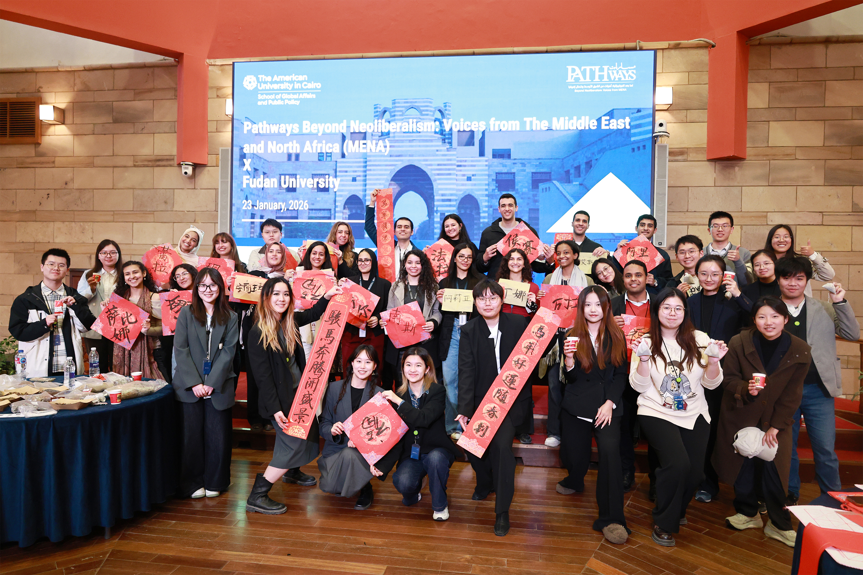 2026年1月23日至24日,首届中国埃及大学生全球治理对话活动在埃及开罗美国大学举办。该活动由复旦大学全球公共政策研究院与开罗美国大学全球事务与公共政策学院联合主办,是2026年“复旦—阿盟卓越实习项目”的一部分,吸引了中埃双方40余名大学生参与。活动以“新自由主义之外的路径:来自中东和北非地区的声音”为主题,围绕全球治理重要议题,通过学术研讨与文化交流相结合的形式,促进中埃青年之间的深入交流与相互理解,探讨青年在全球治理中的角色与责任。
