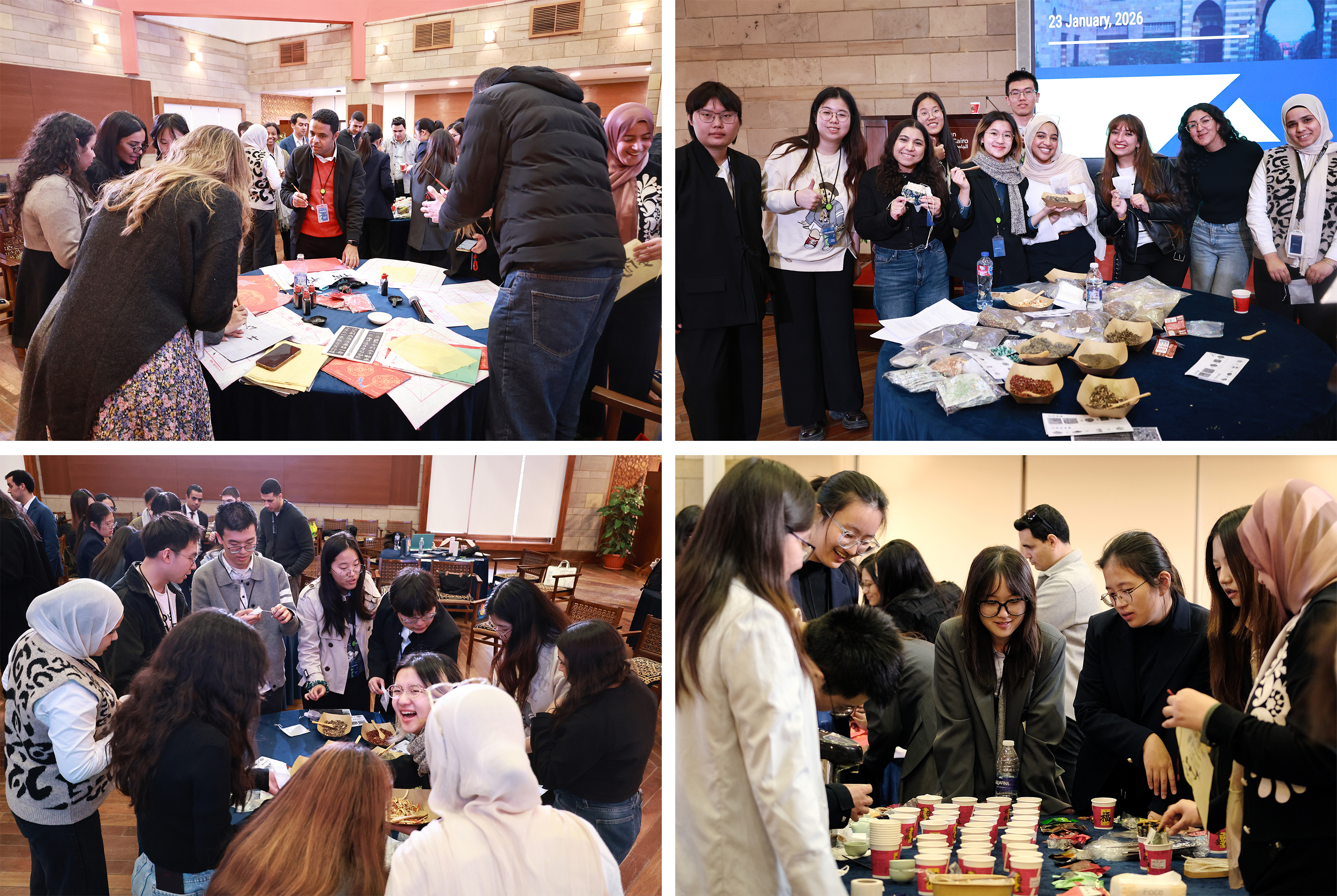 此外,中国大学生还带来了中华文化交流活动,分为中医药、茶文化和书法三个主题。在中医药环节,中埃大学生共同制作安神助眠与预防感冒的香包;茶文化区展示了十余种中国茶,学生细致讲解冲泡方法与功效;书法区则成为焦点,中国学生为开罗美国大学师生书写汉字姓名及节日祝福,分享文字背后的寓意。