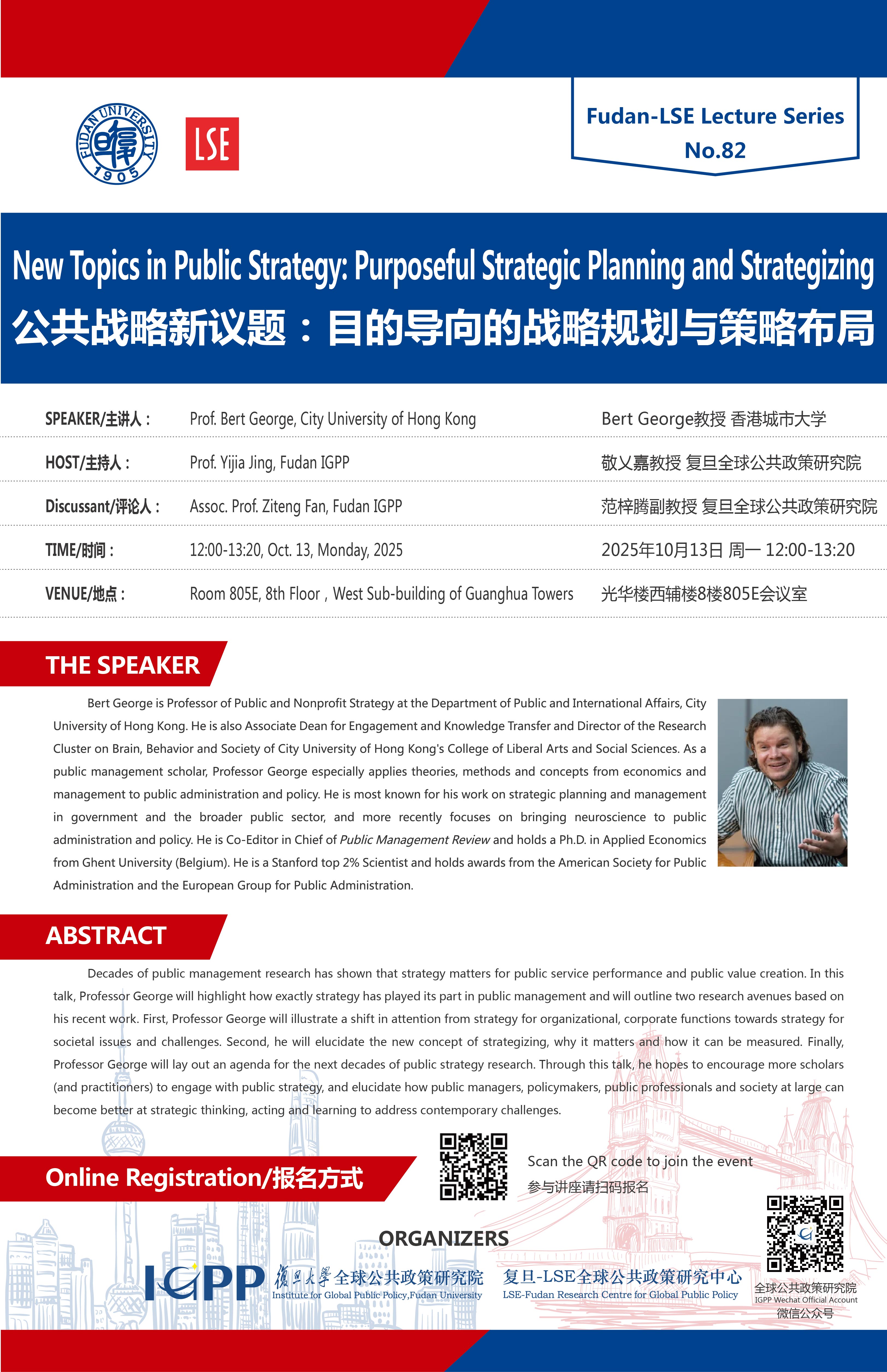 Decades of public management research has shown that strategy matters for public service performance and public value creation. In this talk, Professor George will highlight how exactly strategy has played its part in public management and will outline two research avenues based on his recent work. First, Professor George will illustrate a shift in attention from strategy for organizational, corporate functions towards strategy for societal issues and challenges. Second, he will elucidate the new concept of strategizing, why it matters and how it can be measured. Finally, Professor George will lay out an agenda for the next decades of public strategy research. Through this talk, he hopes to encourage more scholars (and practitioners) to engage with public strategy, and elucidate how public managers, policymakers, public professionals and society at large can become better at strategic thinking, acting and learning to address contemporary challenges.